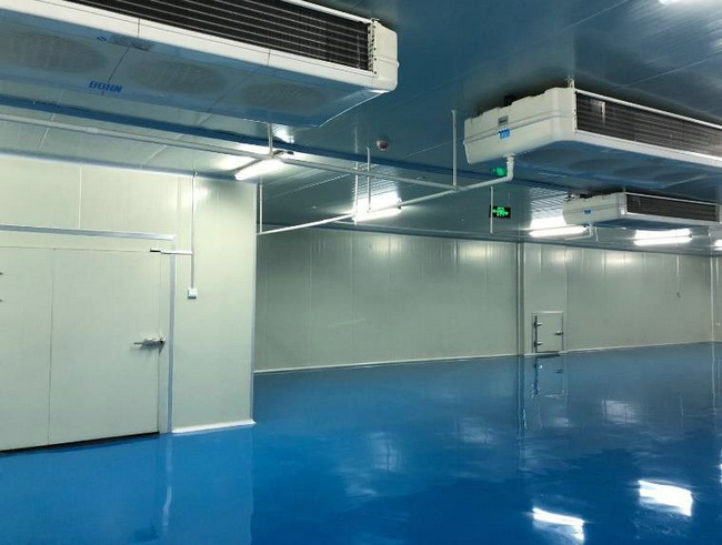 假設建造1000立方米化工防爆冷藏庫,溫度需求0-5℃,15-20℃。我們可以做出如下配置方案:0~5度冷庫內使用二臺比澤爾20匹壓縮機組帶動二臺冷風機、一用一備。陰涼庫配備4臺大金5匹空調風管機組,三用一備。選用FM認證的B1級聚氨酯阻燃雙面彩鋼板,根據冷庫溫度要求,采用100mm厚雙面0.6寶鋼彩板,為了實時監測冷庫內的溫度,在冷庫溫度控制系統之外,配置獨立的溫度監測設備,冷庫所在的甲類倉庫周圍15米范圍內都屬于防爆危險區,通過國家防爆冷庫檢測驗收。