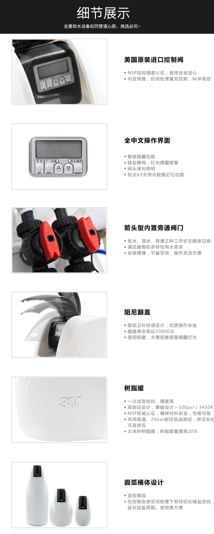 ● 美國(guó)原裝控制閥門,智能提醒功能,長(zhǎng)時(shí)間運(yùn)行可靠,免維護(hù),全中文操作界面更方便,缺鹽蜂鳴,燈光提醒報(bào)警